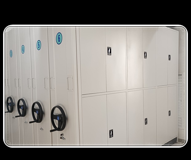 手搖動密集架具有載量多,使用方便等特點,主要用于檔案資料、證券憑證等的存放。主要由軌道、柜體、底盤、面板、門板、目錄卡及傳動裝置、防倒裝置、密封裝置九部分組成: